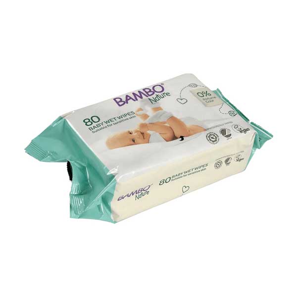 - Toallitas húmedas Bambo Nature 80 unidades.Las toallitas húmedas desechables Bambo Nature están hechas de material suave no tejido, se pueden utilizar cuando se cambian los pañales de los niños, como una servilleta en las comidas o en cualquier situación en la que desea lavar a su hijo. Estas toallitas húmedas se sienten suaves y agradables sobre la piel y son una buena alternativa al agua y el jabón.